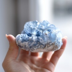 Celestite is very strong and high-vibrational crystal. It helps with communication and spirituality. It has beneficial effects directly on a throat chakra, which is crucial for the clear communication and free expression. It calms our thoughts and gives us more confidence in life.