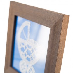 Framed hand-bobbed lace picture with a baby pram motif.