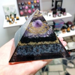 Orgonite pyramid with amethyste and black tourmalin crystal.