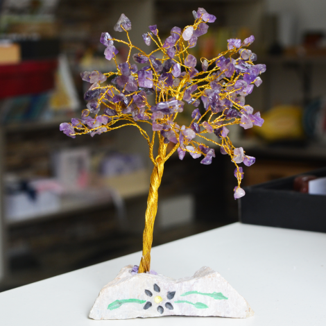 A tree with amethyst crystals on an agate tile can be a great gift or a beautiful decoration that radiates positive energy into your home.