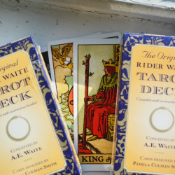 The Rider-Waite Tarot is a revolutionary tarot created in 1909 by artist Pamela Colman Smith under the direction of Arthur Edward Waite. The Rider-Waite tarot was different from all other tarot of that time, as it not only show symbols, but also human images for the first time.