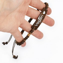Trendi zapestnica, z napisom VEGAN, je čudovit nakit za vse tiste, ki dajejo prednost naravnim materialom, lahko pa je tudi odlična ideja za darilo.